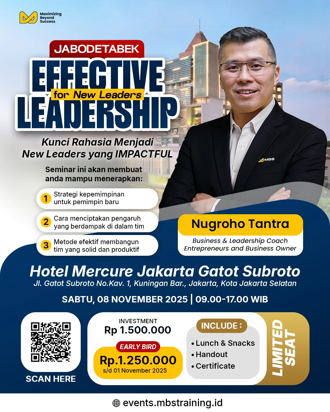 Melalui seminar ini, MBS akan memandu Anda membentuk Leadership Identity anda. Di sini, Anda tidak hanya dibekali skill, tetapi dilatih untuk menjalani identitas baru sebagai EPIC Leader—yaitu sosok pemimpin yang Empowering, Positive, Impactful, dan Consistent. Seminar ini akan membuat kepemimpinan Anda benar-benar mampu menghasilkan ARAH, PENGARUH, dan DAMPAK bagi tim dan perusahaan.